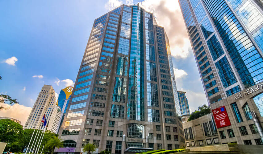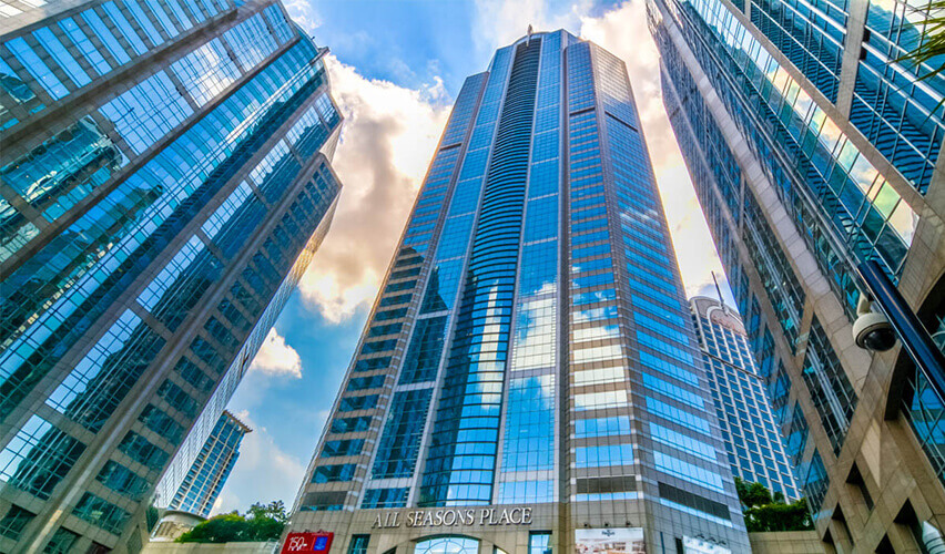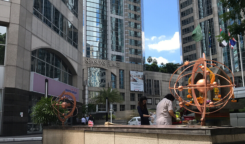 ビジネス街のBTSプルンチット駅から徒歩9分ほどでアクセスできる場所に立地しており、オールシーズンプレイスの一角を成す中層のオフィスビル、「 M Thai Tower(エムタイタワー)」。