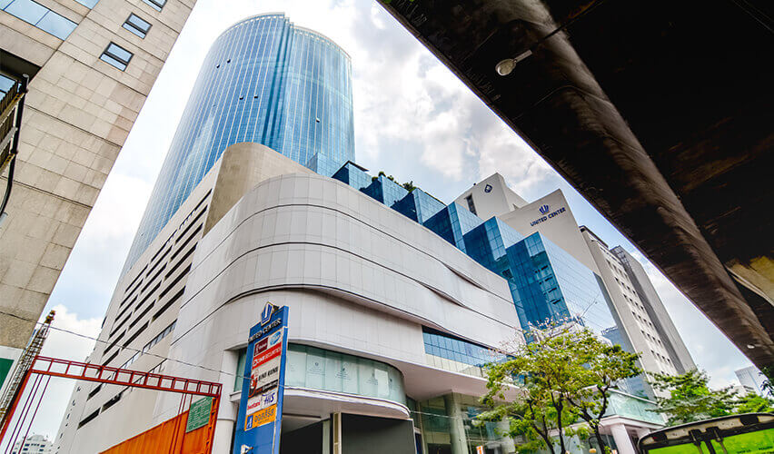 ビジネス街のBTSサラデーン駅徒歩約4分の高層オフィスビル「United Center」。